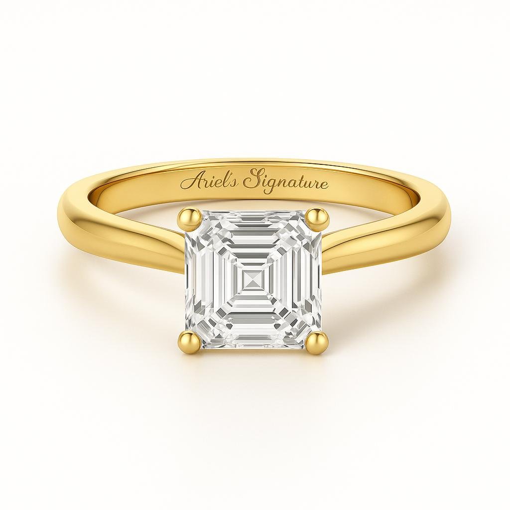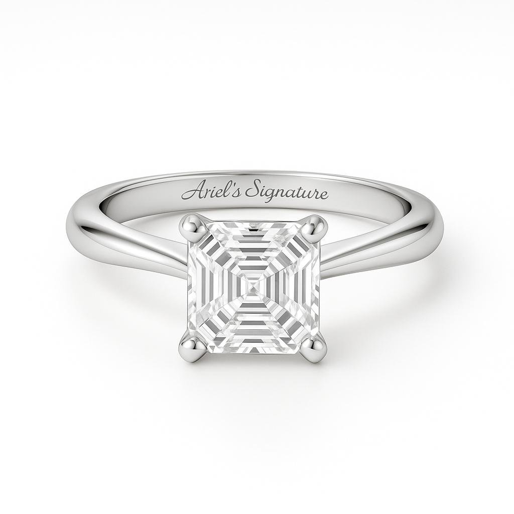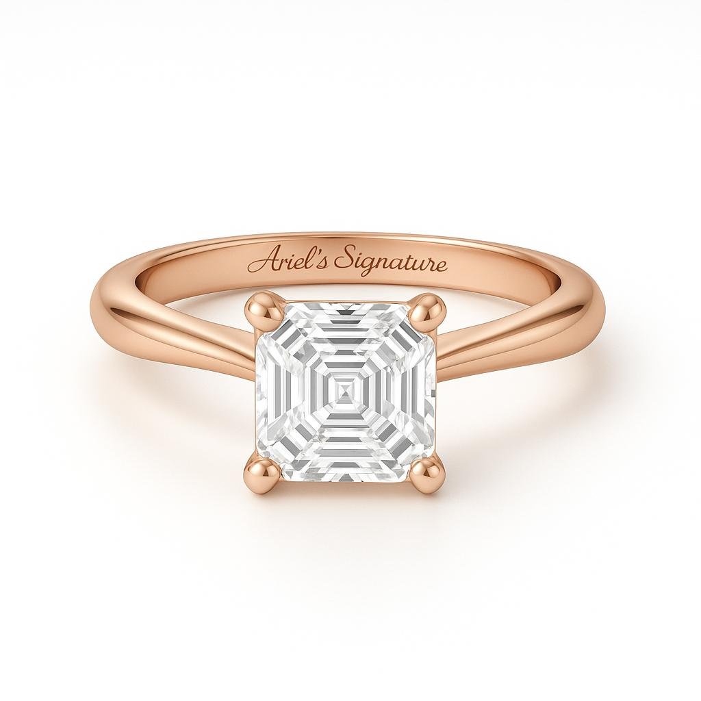 The Asscher Diamond Engagement Ring is a modern and elegant design that showcases the unique brilliance of an Asscher -cut diamond set horizontally. Its sleek east-west orientation creates a contemporary and stylish look while maintaining timeless sophistication. The price included with 1ct Lab Grown Diamond G VS1