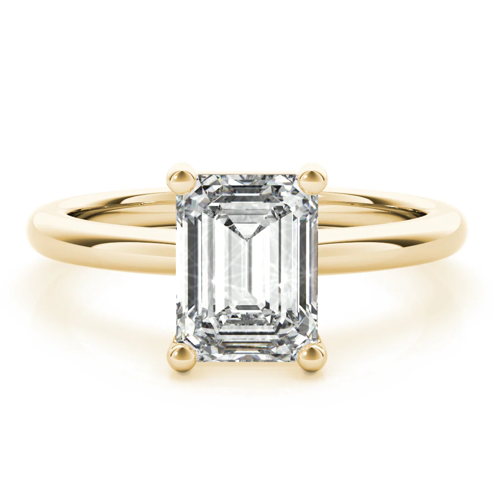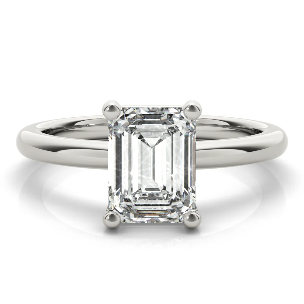 The Aurora Emerald Diamond Engagement Ring is a refined design that highlights the elegance of the emerald-cut diamond. Its graceful setting enhances brilliance and sophistication, making it a timeless symbol of love.