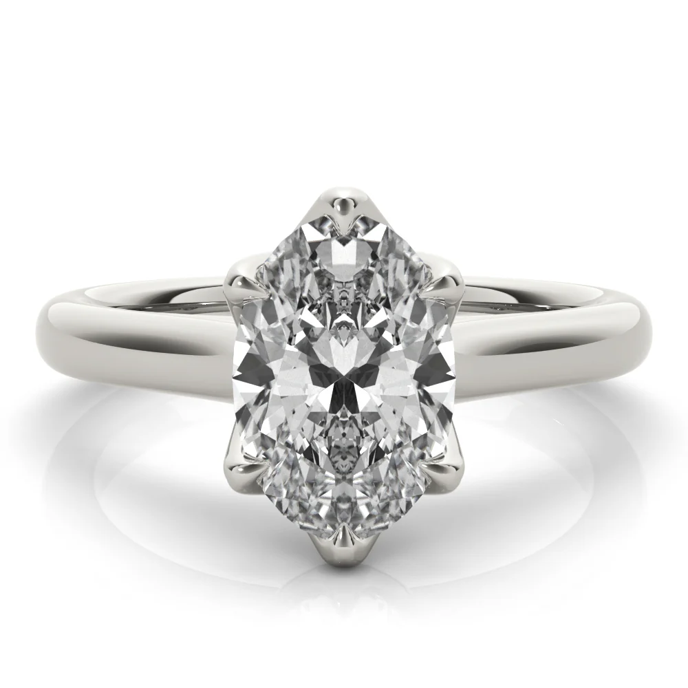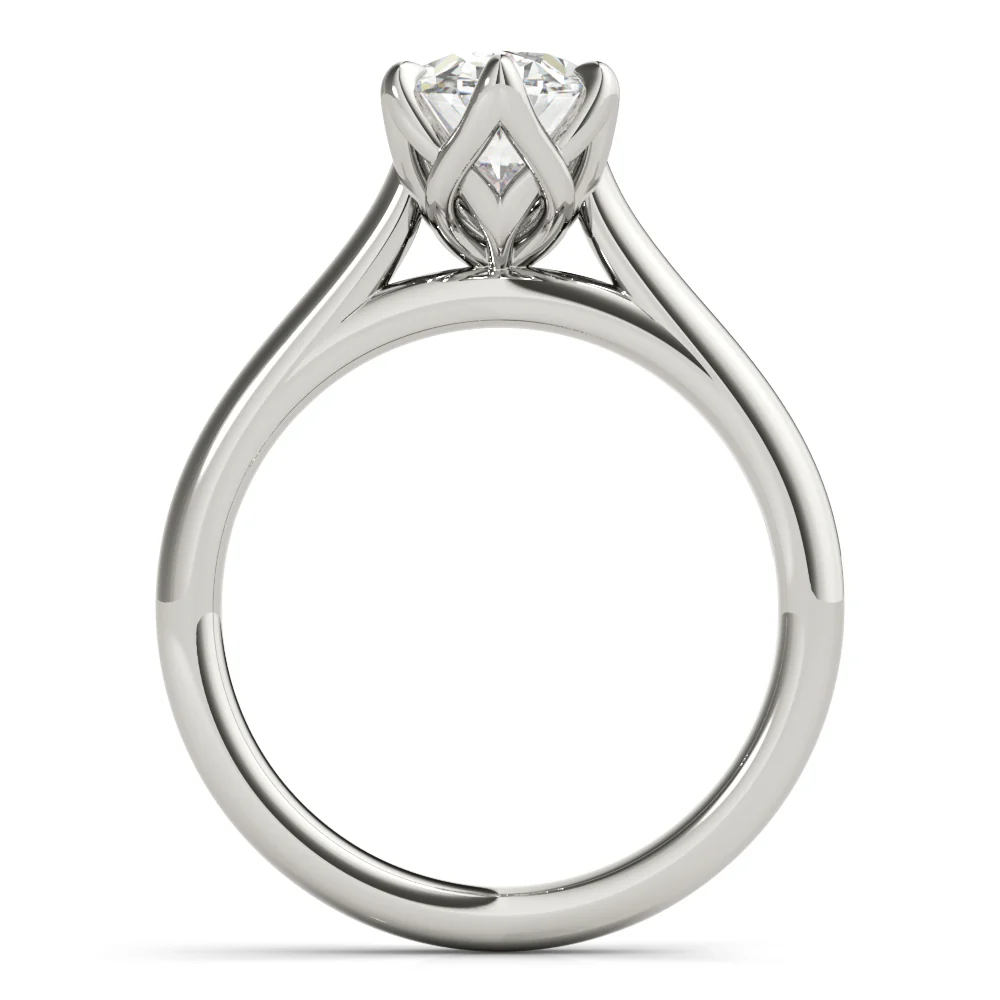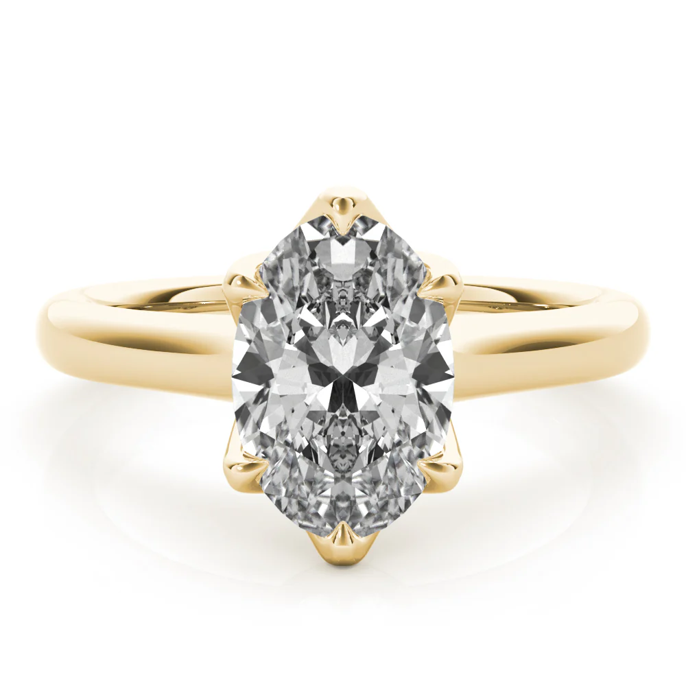 The Celeste Oval 6 Prong Solitaire Engagement Ring is a timeless design crafted to showcase the brilliance of an oval diamond. Its classic 6-prong setting offers both elegance and security, making it a perfect choice for a lasting symbol of love.