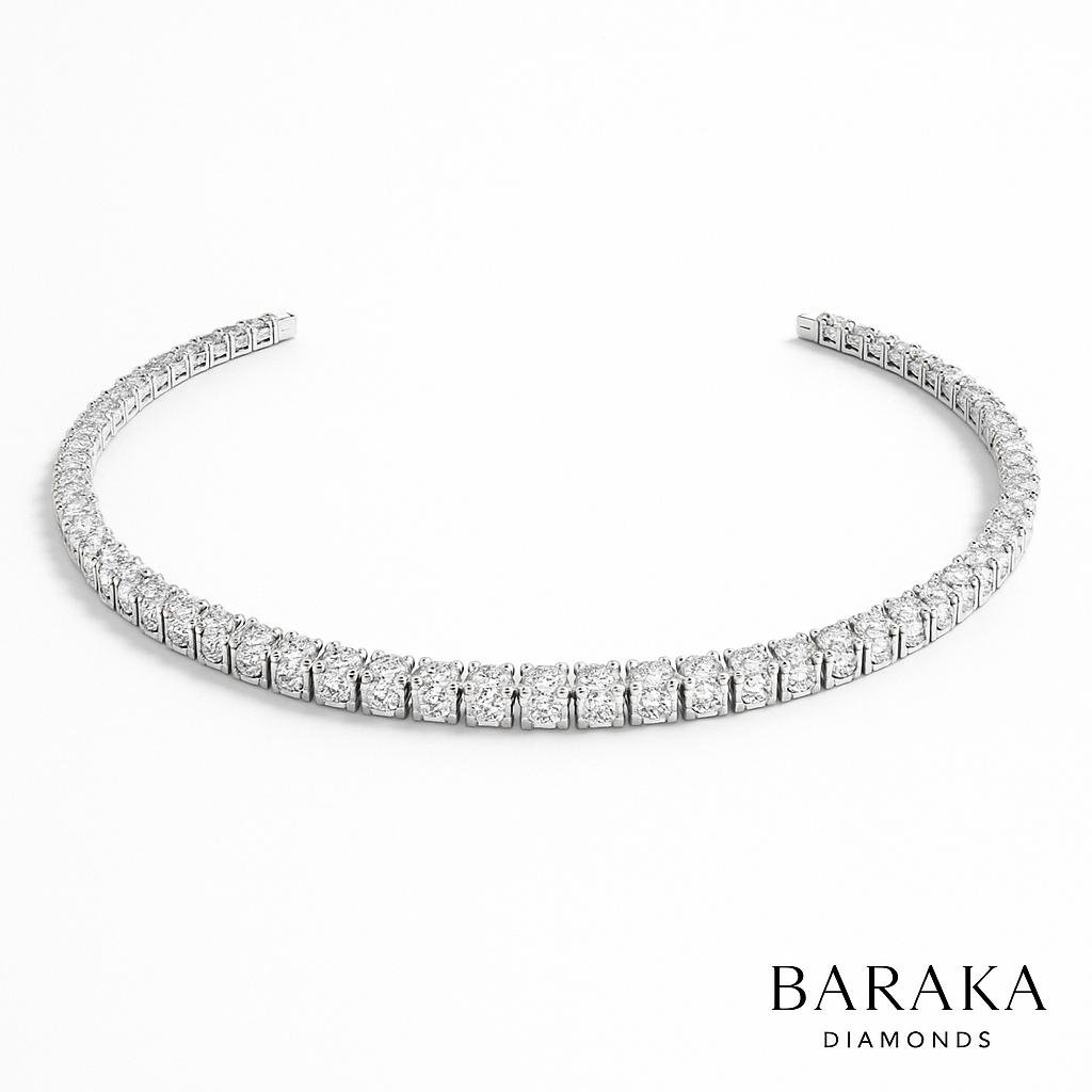 The Diamond Tennis Necklace from Baraka Diamonds is the epitome of sophistication — a continuous row of brilliant-cut diamonds set flawlessly in 18K gold, 14k gold, designed to shimmer with every movement. Each diamond is carefully chosen for exceptional fire, ensuring unmatched brilliance in every angle.