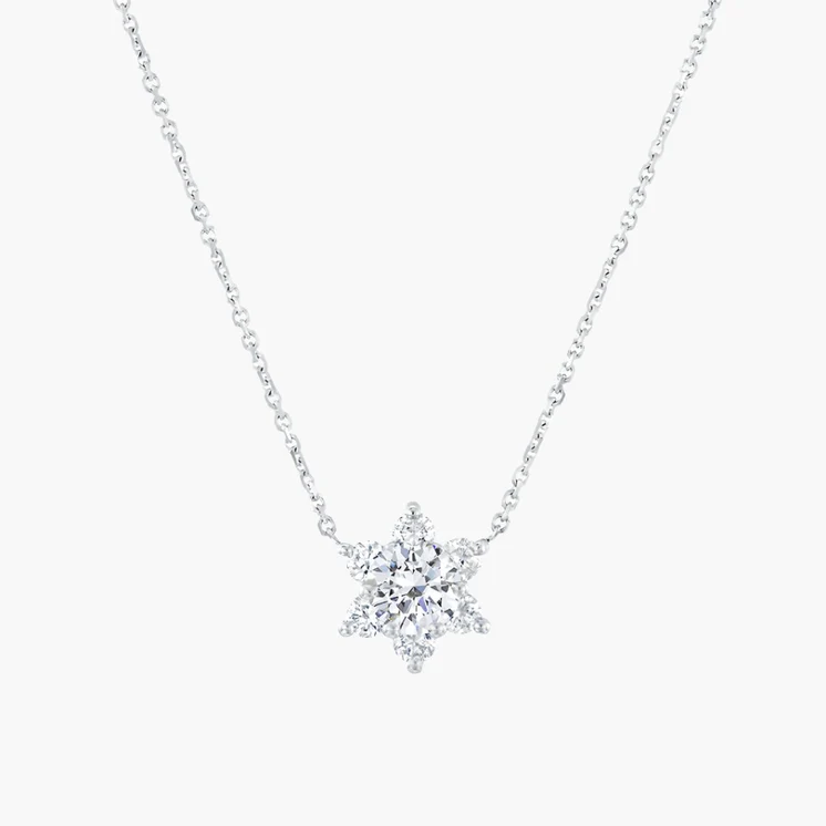 Inspired by the delicate beauty of nature, the Elowen Diamond Petal Necklace is a timeless masterpiece crafted in 14K white gold. At its heart lies a 0.20-carat D-color, VS1 clarity diamond, surrounded by six smaller diamonds totaling 0.12 carats, forming a graceful petal-like halo. Its elegant floral design captures light beautifully, making it a perfect piece for both everyday sophistication and special occasions.