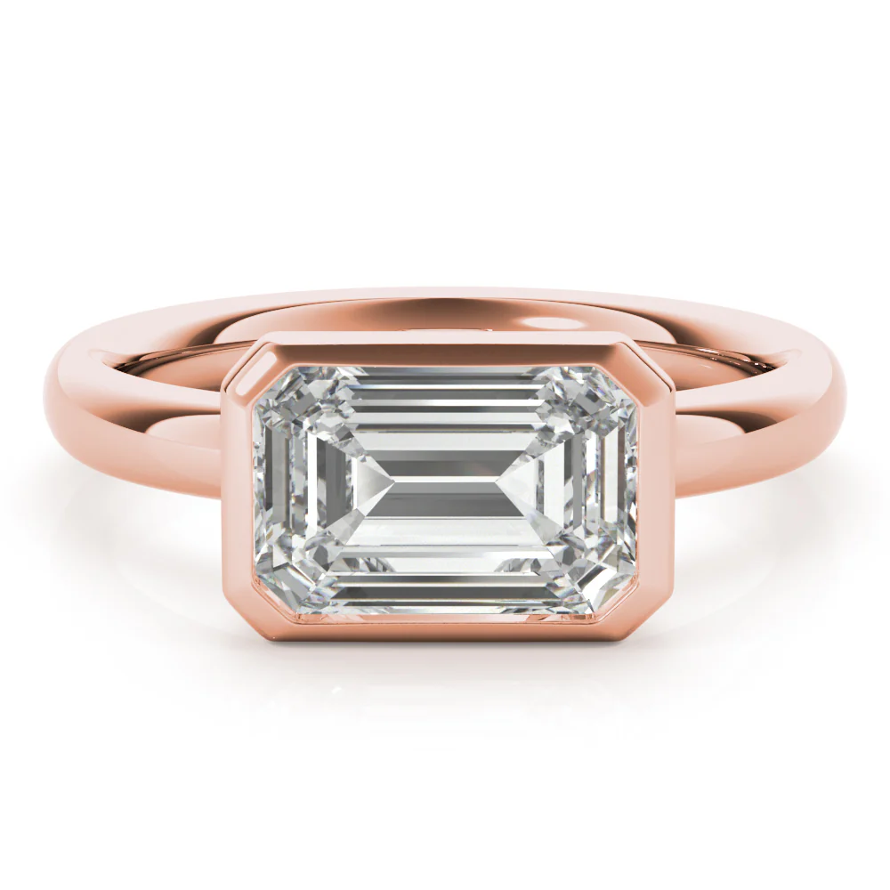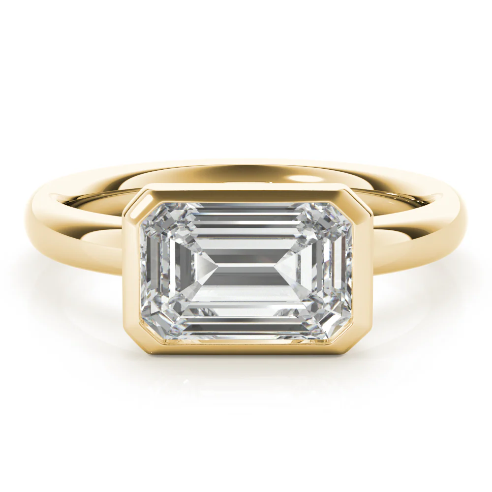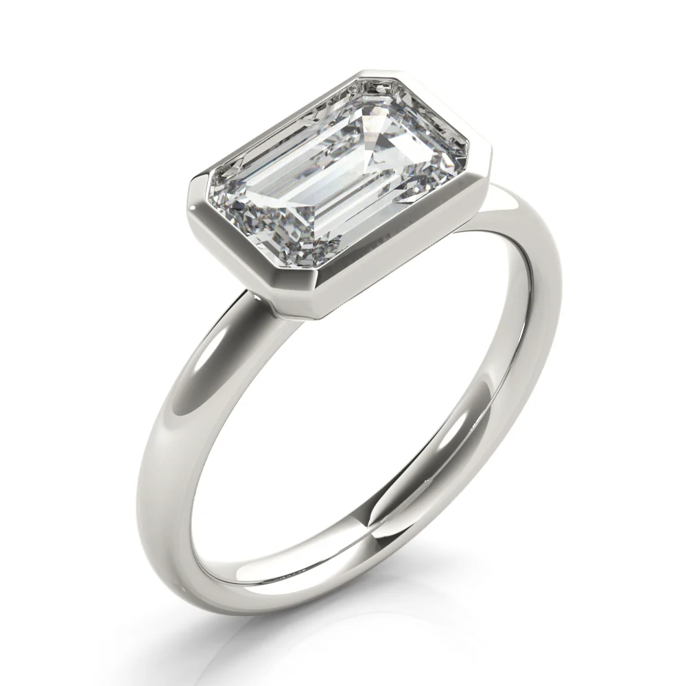The Lumina Emerald Cut Bezel Engagement Ring is a modern and sophisticated design that beautifully showcases an emerald-cut diamond within a sleek bezel setting. Its clean lines and contemporary style create a striking, elegant look.