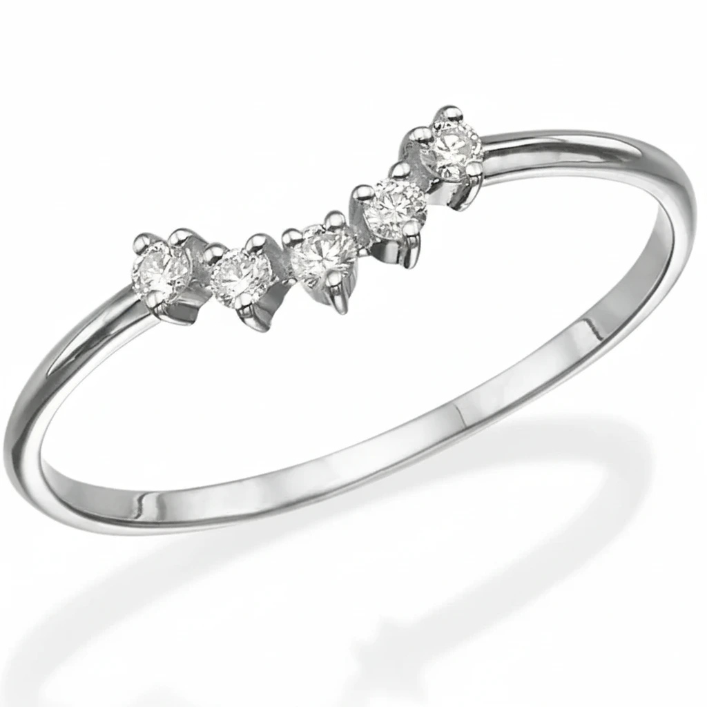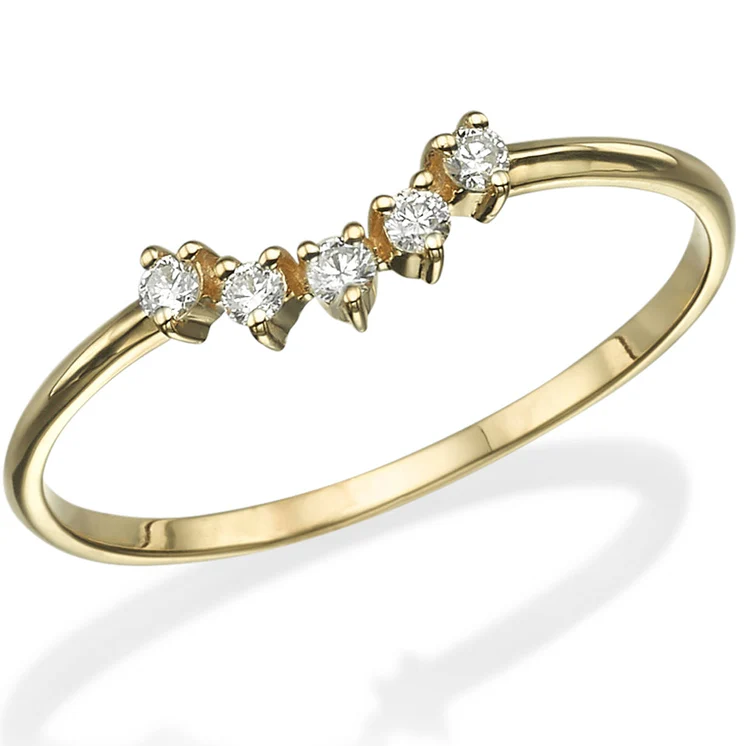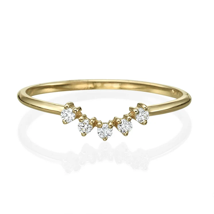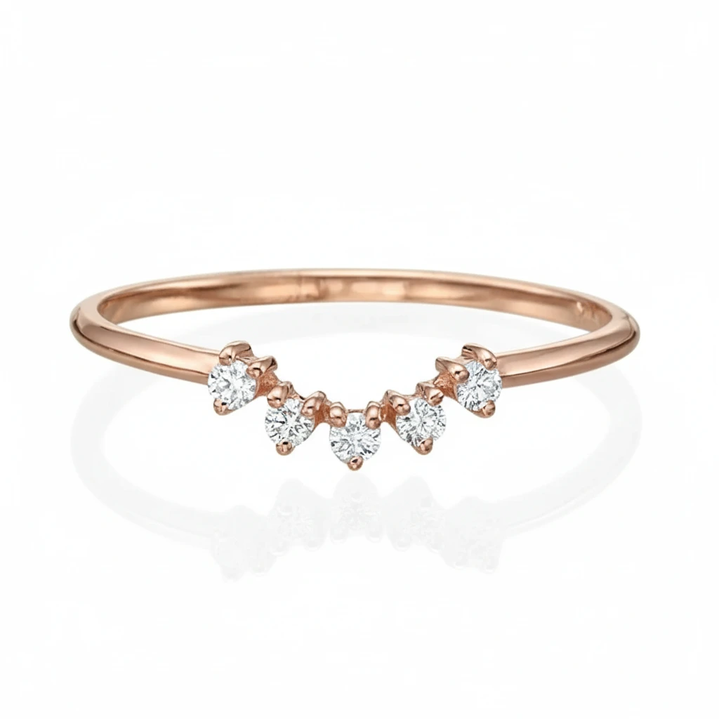 Graceful and enchanting, the Luminara Leaf Diamond Wedding Band showcases a delicate half-halo leaf design adorned with 5 hand-set brilliant diamonds totaling 0.10 carats. Crafted in solid 14K rose gold, each diamond is expertly prong-set to maximize brilliance and elegance. This refined band is perfect as a wedding ring, an engagement complement, or a stackable luxury piece, adding a touch of nature-inspired sophistication to every look.