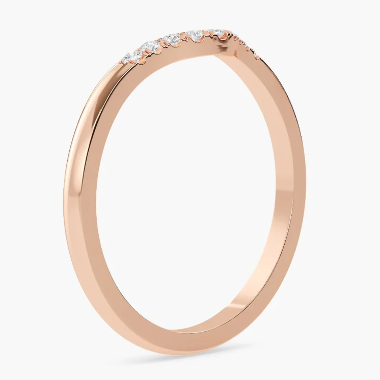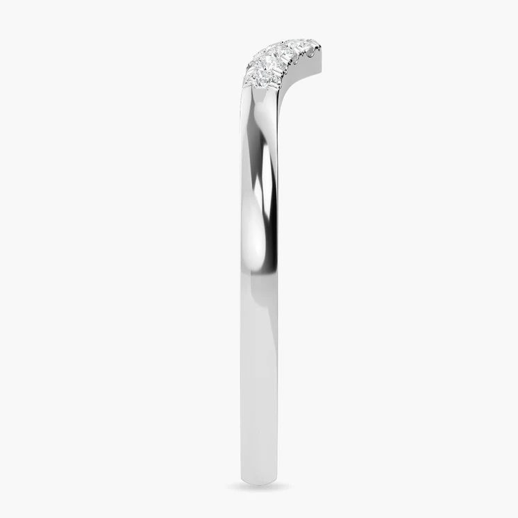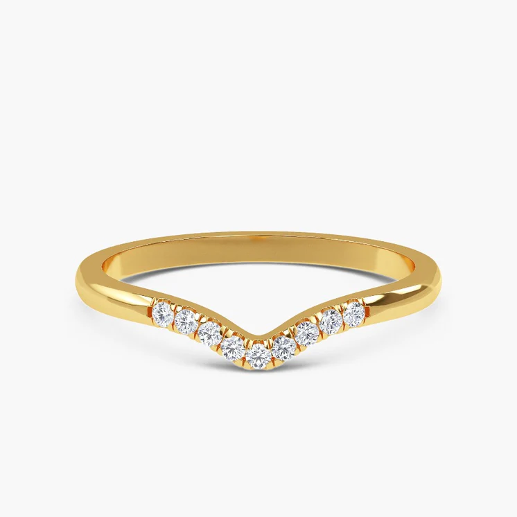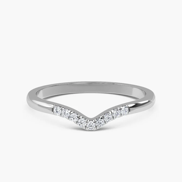 Graceful and refined, the Velanthia Curved Pave Diamond Wedding Band features a soft chevron-inspired curve adorned with nine brilliant pavé-set diamonds totaling 0.09 carats. Handcrafted in 14K white gold, this delicate band adds a touch of sparkle that flows elegantly along the finger. Its subtle arc makes it perfect for stacking, pairing with engagement rings, or wearing alone as a minimalist yet luxurious statement.